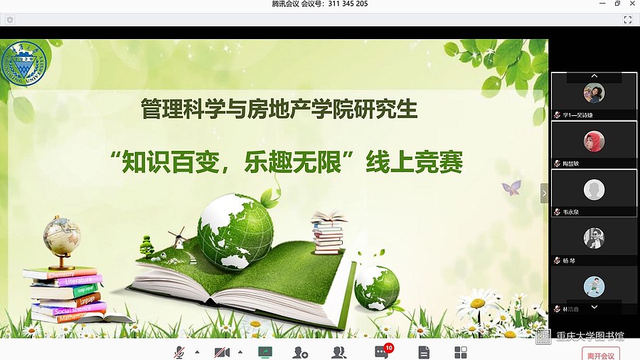 2020年4月6日晚上,重庆大学管理科学与房地产学院主办、管科学院团委研究生会学术部承办的“知识百变、乐趣无限”线上竞赛活动顺利举行。本次活动旨在丰富和拓展研究生的知识面,以“学”为乐,以“智”会友,营造学知识、用知识和爱知识的氛围,并加强同学们对于新冠疫情的关注和了解,在丰富学习生活的同时增强防疫意识,展示严峻形式下重大学子的风采。