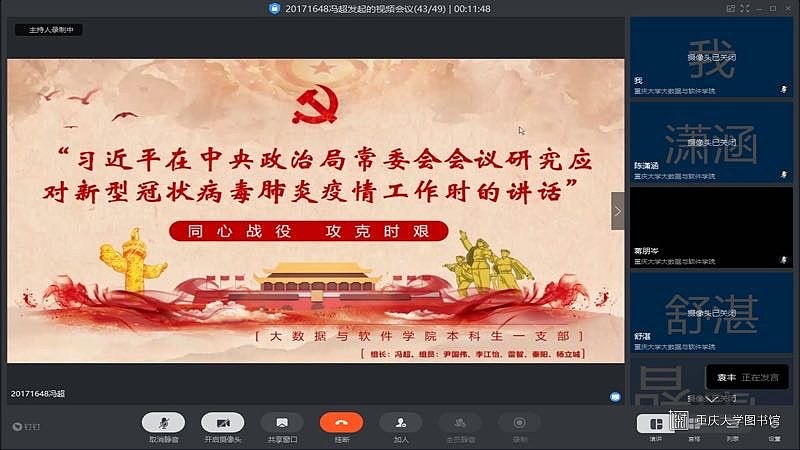 2020年3月22日,大数据与软件学院本科生一支部开展3月第二次线上主题组织生活会。支部全体成员通过支部钉钉群直播对《习近平在中央政治局常委会会议研究应对新型冠状病毒肺炎疫情工作时的讲话》进行了全面的学习。