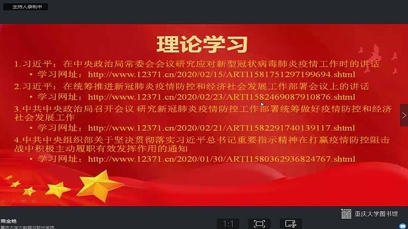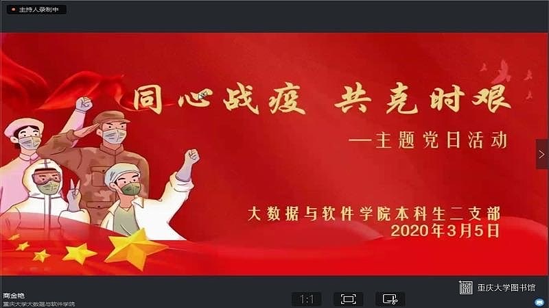 2020年3月6日,大数据与软件学院本科生二支部通过钉钉视频会议线上方式,开展了“同心战疫 共克时艰”主题党日活动,活动包括理论学习、竞答环节、自由交流三个部分。学院党委书记文俊浩及支部全部党员参加,支部书记谭登梅主持活动。