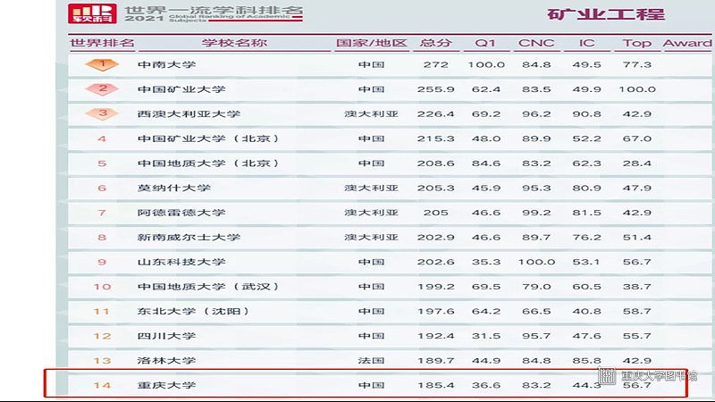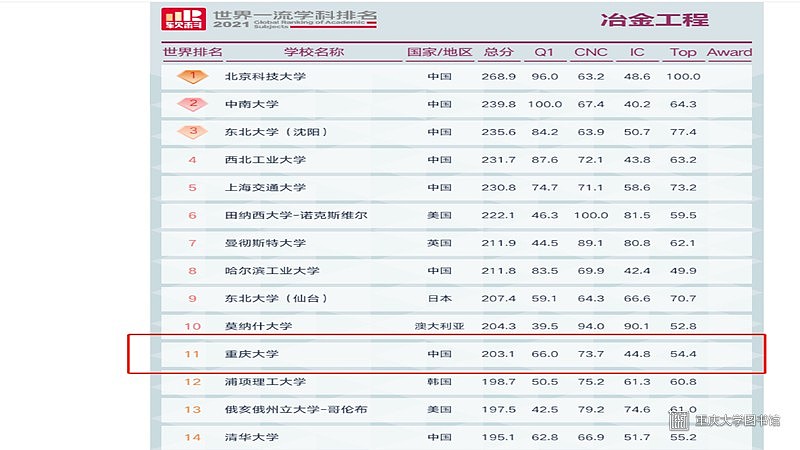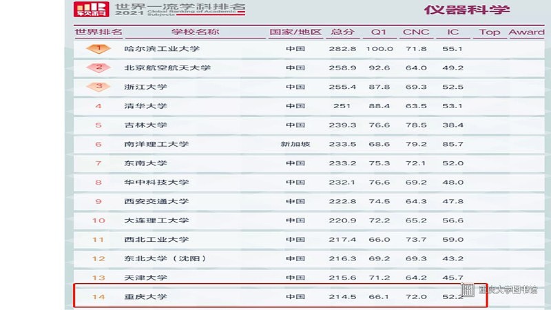 2021年5月26日,高等教育评价专业机构软科发布2021”软科世界一流学科排名”,重庆大学共有22个学科入榜。重庆大学入榜的22个学科中,全球前50名学科共7个,位居内地高校第17名;全球前100名学科9个;全球前150名学科17个,较去年增加6个,学科质量水平不断提升。
