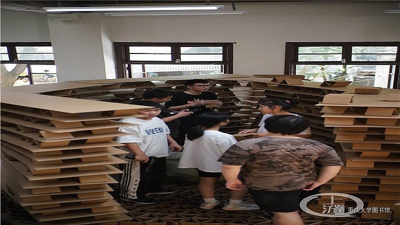8小时内,所有参赛队伍分别利用瓦楞纸板、PP板、竹材和木材四种材料,将已经推敲了近一个月的方案按照1:1的比例实地搭建出来。