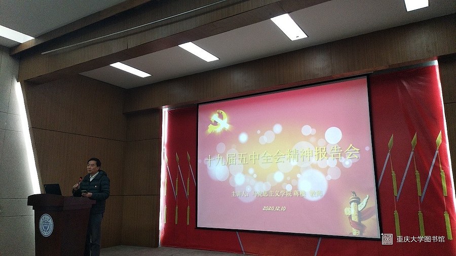 2020年12月10日上午,重庆大学药学院全体党员在报告厅参加了十九届五中全会精神报告会,参加此次大会人员包括药学院全体教师及学生党员共计130余人。会议由凌明书记主持,主讲人是来自重庆大学马克思主义学院的蒋楼教师。