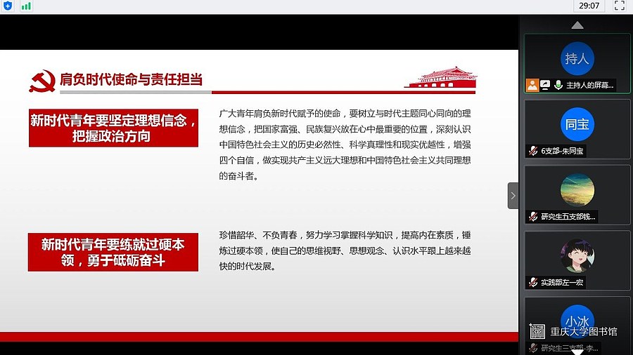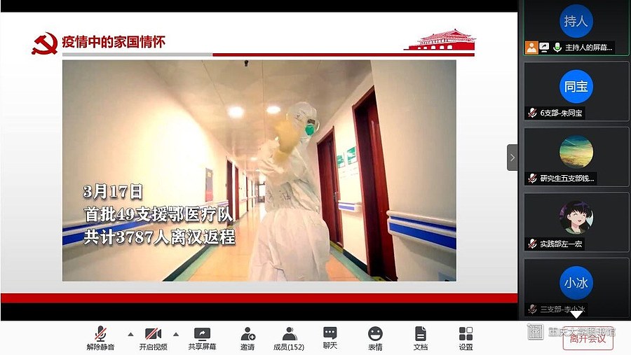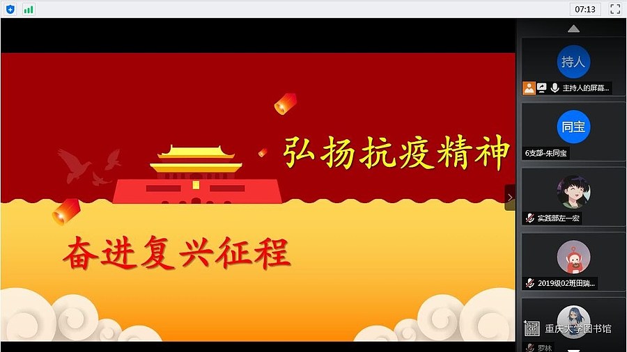 2020年6月5日晚19:30,为响应习近平总书记学习和弘扬抗疫精神的号召,重庆大学光电工程学院研究生团委在腾讯会议线上举行了一次特别的党团活动。我院光电学子积极参与其中,到会议开始前,已经有大量的同学入场就绪。