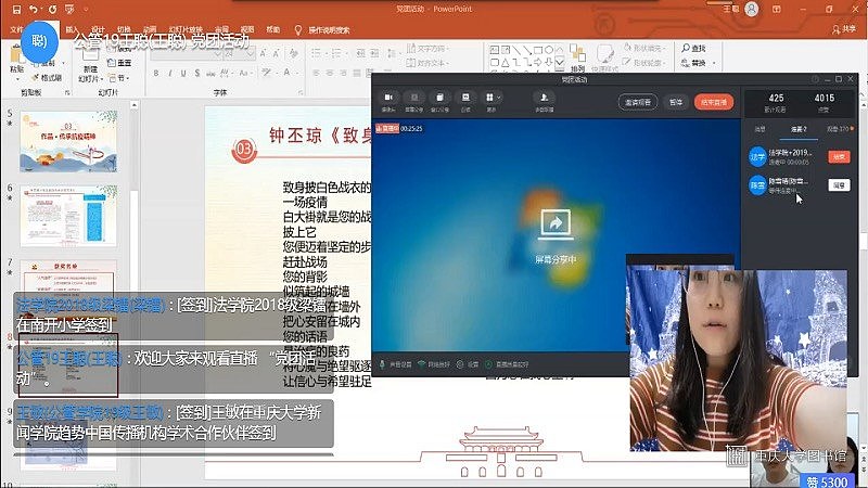 为深入学习贯彻落实习近平总书记对新冠肺炎疫情的重要指示精神和回信精神,充分发挥学生基层党团组织的战斗堡垒作用,号召广大研究生向抗疫奉献者学习,重庆大学法学院研究生团委携手公共管理学院研究生团委,联合举办以“弘扬抗疫精神,奋进复兴征程”为主题的党团活动。活动于2020年6月6日14:30通过“钉钉会议”在线上开展,由法学院温延栋、公共管理学院王聪主持。两院500余名研究生参加了此次党团活动。