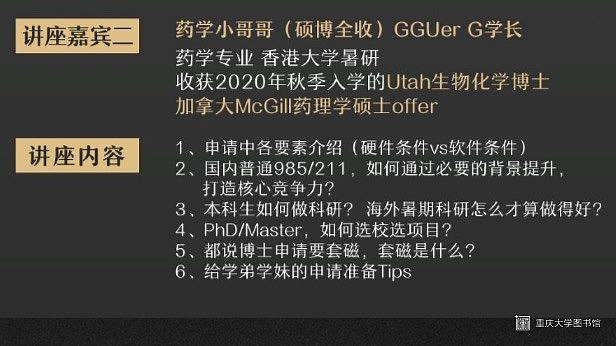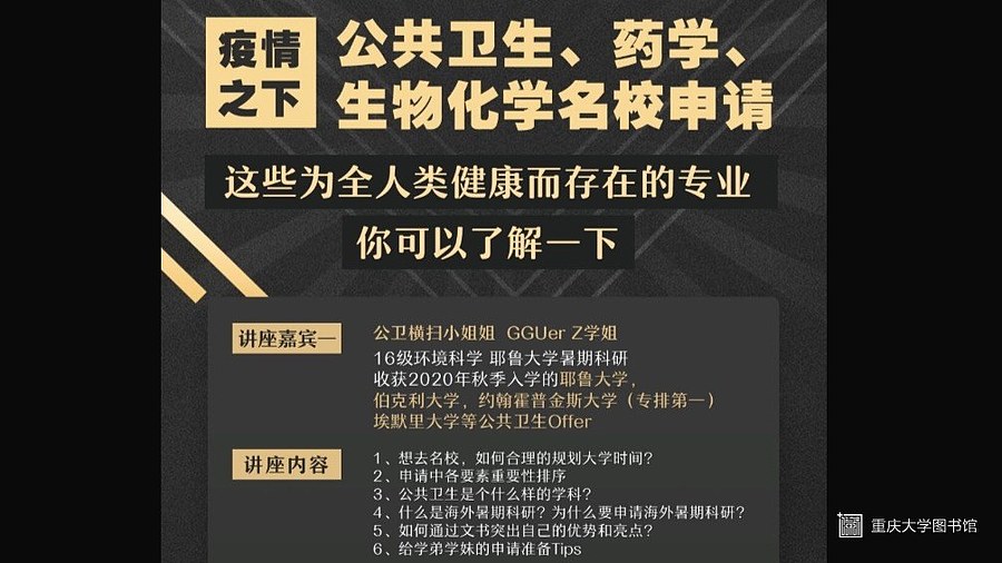 中国农历庚子鼠年,一场突如其来的新冠肺炎疫情席卷全国。与此同时,越来越多的人关注到了公共卫生、药学等领域。在重大学子返校之际,为了进一步拓展相关专业学生的国际视野,提高学生综合素质,帮助学生提前做好留学规划,2020年5月17日,重庆大学药学院举办了线上留学经验分享的微讲座。