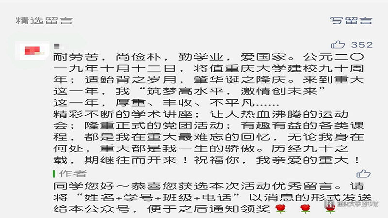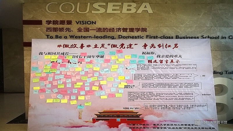 为庆祝祖国七十周年华诞和重庆大学九十周年的生日,重庆大学经济与工商管理学院“红岩先锋”研究生党支部创建组以新媒体为载体,立足“微党建”创建,特别推出了以“微故事”为主题的系列活动。本次主题活动分为线上活动“祝福你,我亲爱的重大!”和线下活动“我与祖国共成长——庆祝祖国七十周年华诞”两部分。此次系列活动吸引了众多经管学院研究生学子的关注,特别是经管学院15个研究生党支部的同志。大家积极参与到活动中,纷纷用朴实的话语表达了对祖国、对学校的感激和热爱之情。