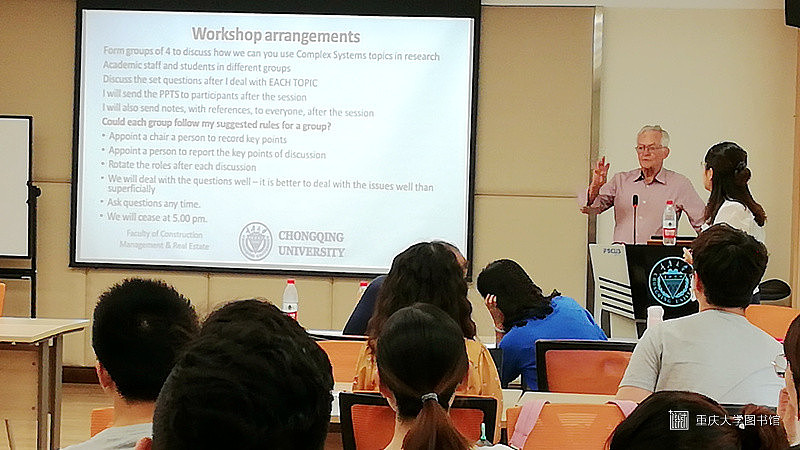 2019 年6月4日下午2点半,澳大利亚阿德莱德大学复杂系统荣誉教授、重庆大学管理科学与房地产学院外籍专家、教授Vernon Ireland在重庆大学管科学院楼210教室开展以“系统思维及其在工程(城市)的应用讲习(Systems Thinking for Research)”为主题的讲座。本次讲座由重庆大学管理科学与房地产学院教授叶堃晖主持,副教授漆玲玲担任翻译, 参加本次讲座的主要是管科学院的多位老师和硕士研究生。