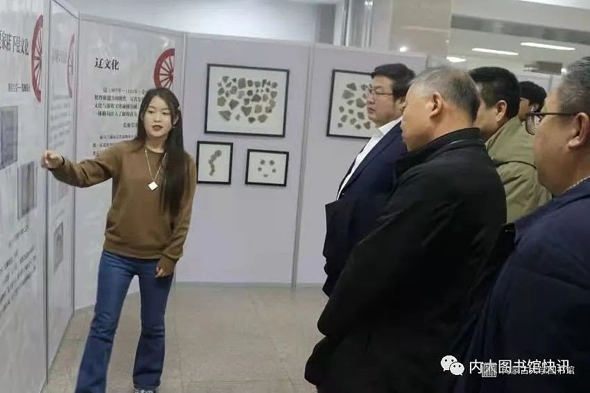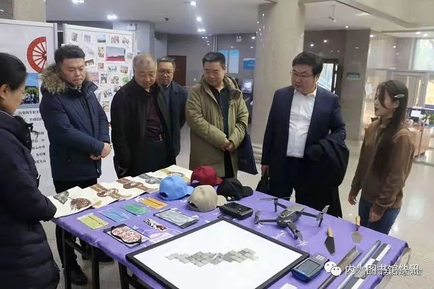 12月5日,内蒙古自治区教育厅科技与信息化处乌力吉巴特尔调研员、孙瑞阳老师;自治区高校图工委副主任:内蒙古师范大学图书馆馆长周越,内蒙古农业大学图书馆馆长付学良,内蒙古工业大学图书馆党总支书记郭俊平;自治区高校图工委常务委员:内蒙古医科大学图书馆馆长王锋,内蒙古财经大学图书馆馆长李宏旺,内蒙古党校图书馆馆长王晓燕,呼和浩特职业学院图书馆馆长索丽霞等在参加了内蒙古地区高校图书馆榜样馆员评审会之后,在自治区高校图工委主任、内蒙古大学图书馆馆长刘实、自治区高校图工委副秘书长、内蒙古大学图书馆信息咨询部副主任杨爱英等陪同下参观了在内蒙古大学图书馆举办的《奈曼寻古——内蒙古大学2019级文博考古班田野实习考古实习成果展》。