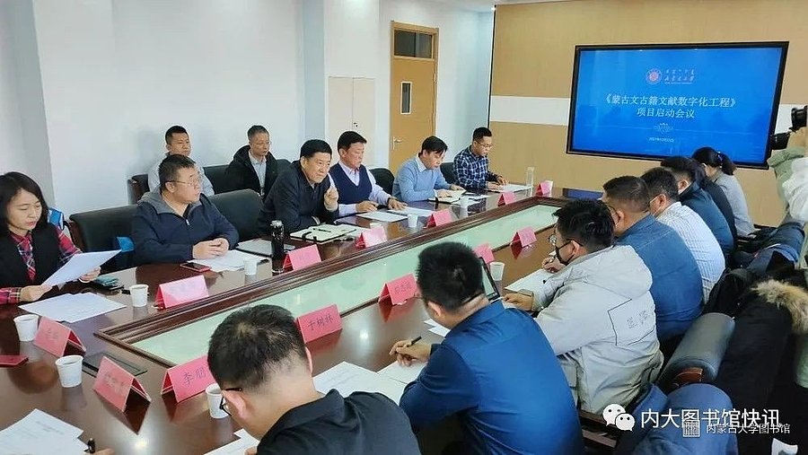 12月23日上午,我校召开“蒙古文古籍文献数字化工程”项目启动会。副校长额尔很巴雅尔出席会议,内蒙古社会科学院图书馆馆长王智、我校社科处处长达胡白乙拉、图书馆馆长刘实、档案馆馆长李华、计算机学院院长周建涛、蒙古文智能信息处理技术国家地方联合工程研究中心副主任飞龙、计算机学院魏宏喜教授,以及项目中标单位中国电信、同方知网、联图科技、敏通监理负责人参加会议。项目启动会由飞龙主持。