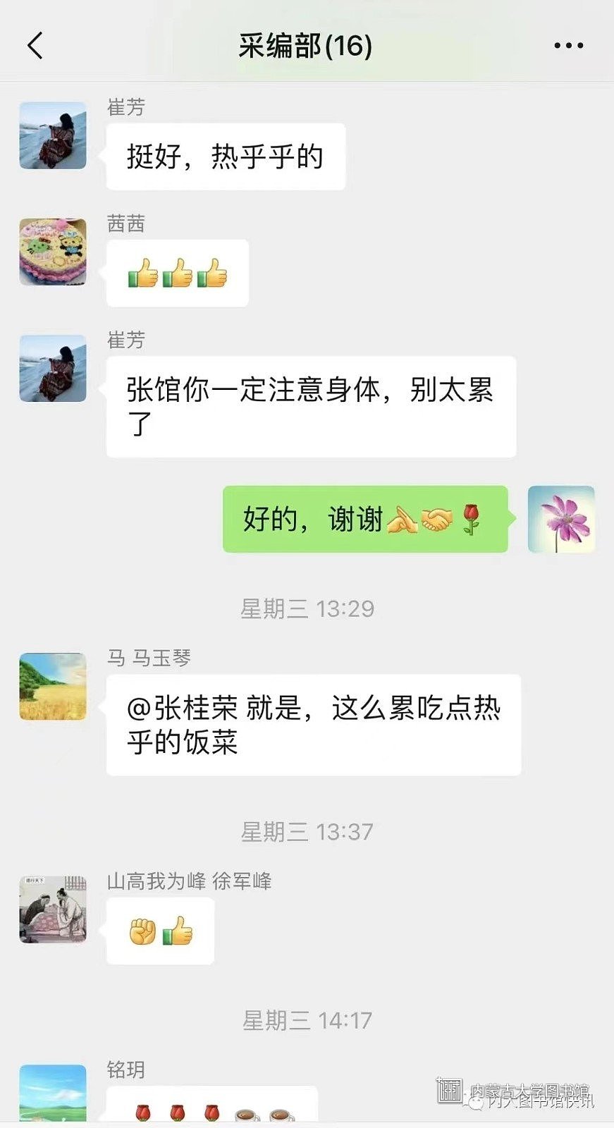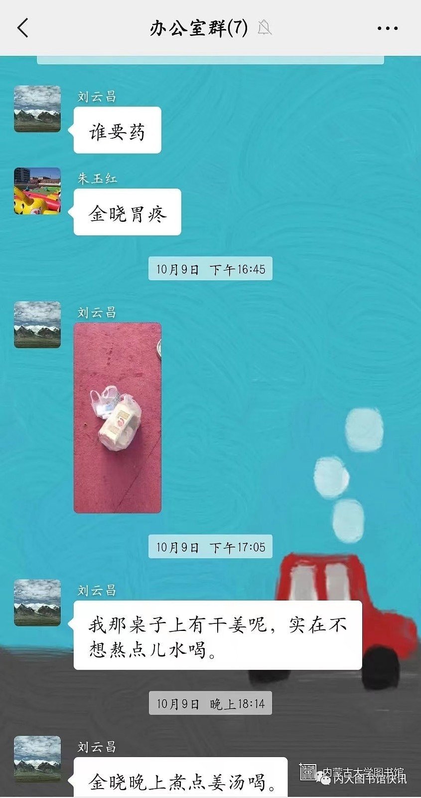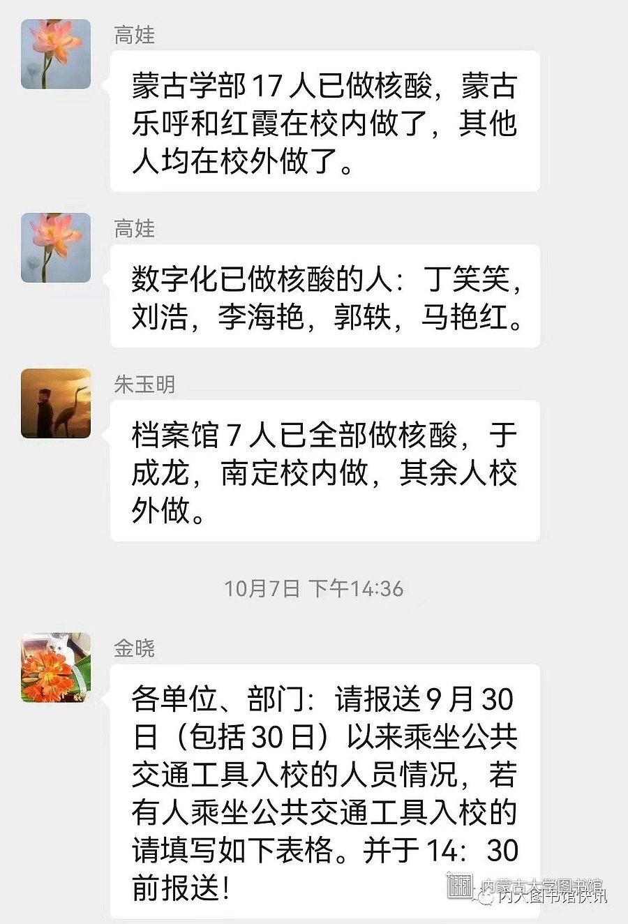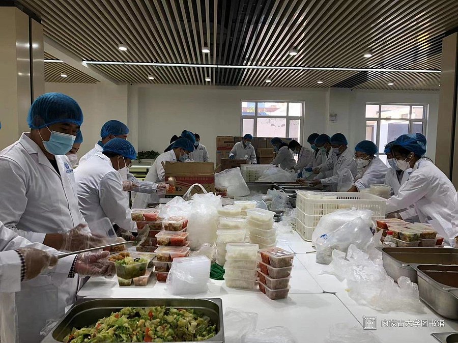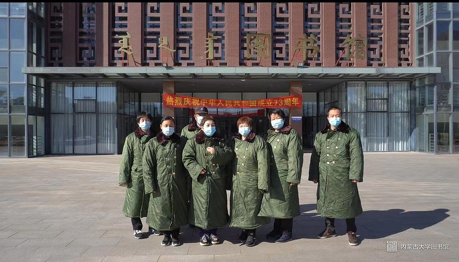 在抗击疫情的战斗中,内蒙古大学图书馆第二批驻馆老师共25人(其中1人特殊情况于10月4日撤出,馆员5人,学生助理馆员9人,保安保洁10人),在仅有的5名馆员中就有张桂荣、席金晓、包俊亮、刘静4名共产党员,她们只是1.5万名教职工中的一分子,微乎其微,但她们撑起一片蓝天,守住了一方净土。