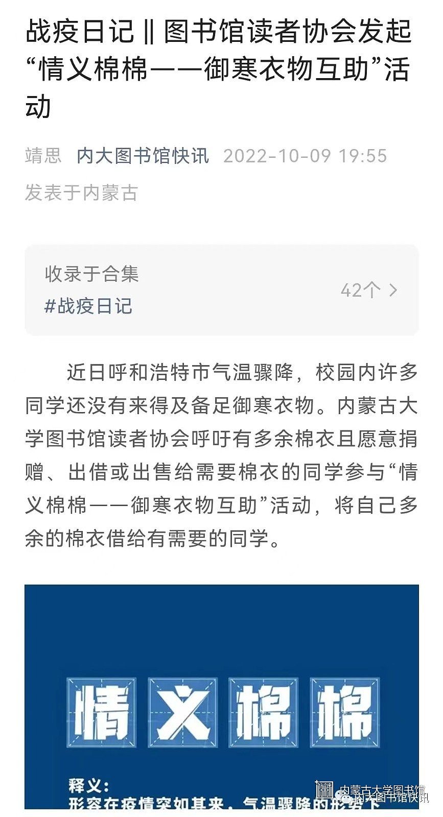 驻馆老师的困难牵动着图书馆所有人的心,大家积极行动起来,纷纷伸出援手。10月9日,图书馆读者协会发起“情义棉棉——御寒衣物互助”活动,10月10日,驻校学生踊跃参加读者协会的互助活动,共吸引了四个校区近千名学生参与进来。