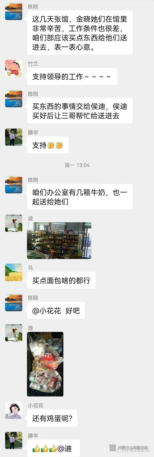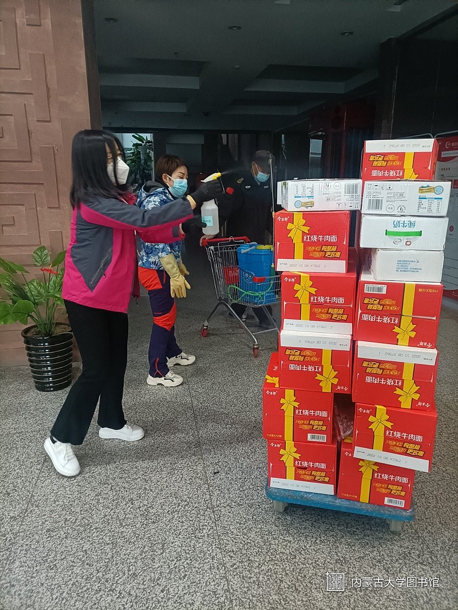 图书馆向广大校友,合作单位紧急求助。一时间,合作单位,社会贤达慷慨解囊,我们的老朋友超星集团杨宏杰先生向图书馆伸出援助之手,紧急采购抗疫物资,并于10月9日深夜至10月10日下午将捐赠的棉衣、方便面、火腿等分别配送到图书馆南北校区。万方集团孙彪先生向图书馆伸出援助之手,紧急采购大量蒙清荞面、蒙清“吃粗来”、蒙清重庆小面、自热米饭、榨菜等速食食品,并于10月11日上午分别送达图书馆南北校区。湖北三新文化传媒有限公司牛彦珑先生主动伸出援助之手,慷慨捐助5300个N95口罩和医用外科口罩,并于10月12日下午送达图书馆。