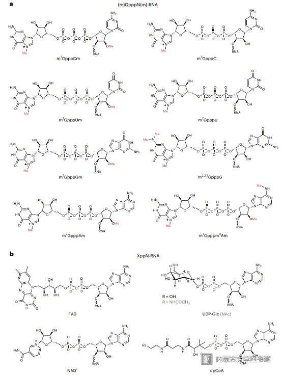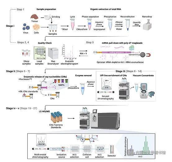 CapQuant结合离线HPLC富集端帽核苷酸(CNs)和同位素稀释液相色谱-串联四极杆质谱法(LC-MS/MS),实现了多种类型的RNA端帽结构(图1)的高灵敏度(attomole-femtomole)、高化学特异性的绝对定量。
