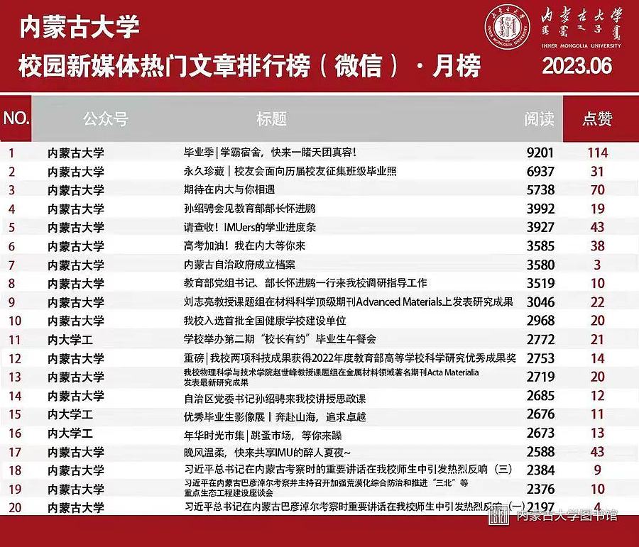 看完了六月内蒙古大学微信公众号影响力排名情况之后,希望各个平台能继续推出更受师生欢迎的精彩文章,也希望有媒体平台能加入排名一起打榜,营造和谐、积极向上的网络空间 !