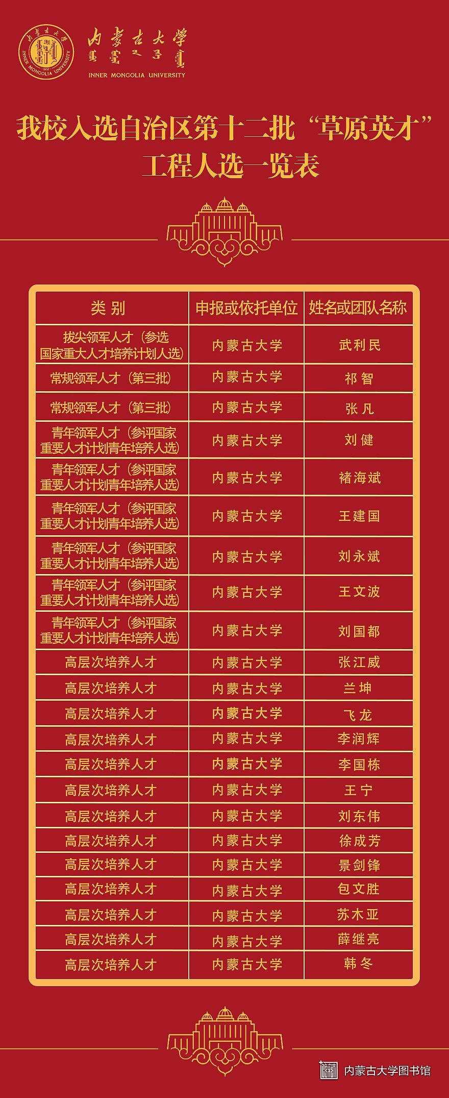 近日,第十二批“草原英才”工程评选结果揭晓,我校22名教师入选。其中,我校党委副书记、常务副校长武利民入选拔尖领军人才,祁智、张凡入选常规领军人才(第三批);刘健、褚海斌、王建国、刘永斌、王文波、刘国都入选青年领军人才;张江威、兰坤、飞龙、李润辉、李国栋、王宁、刘东伟、徐成芳、景剑峰、包文胜、苏木亚、薛继亮、韩冬入选高层次培养人才。
