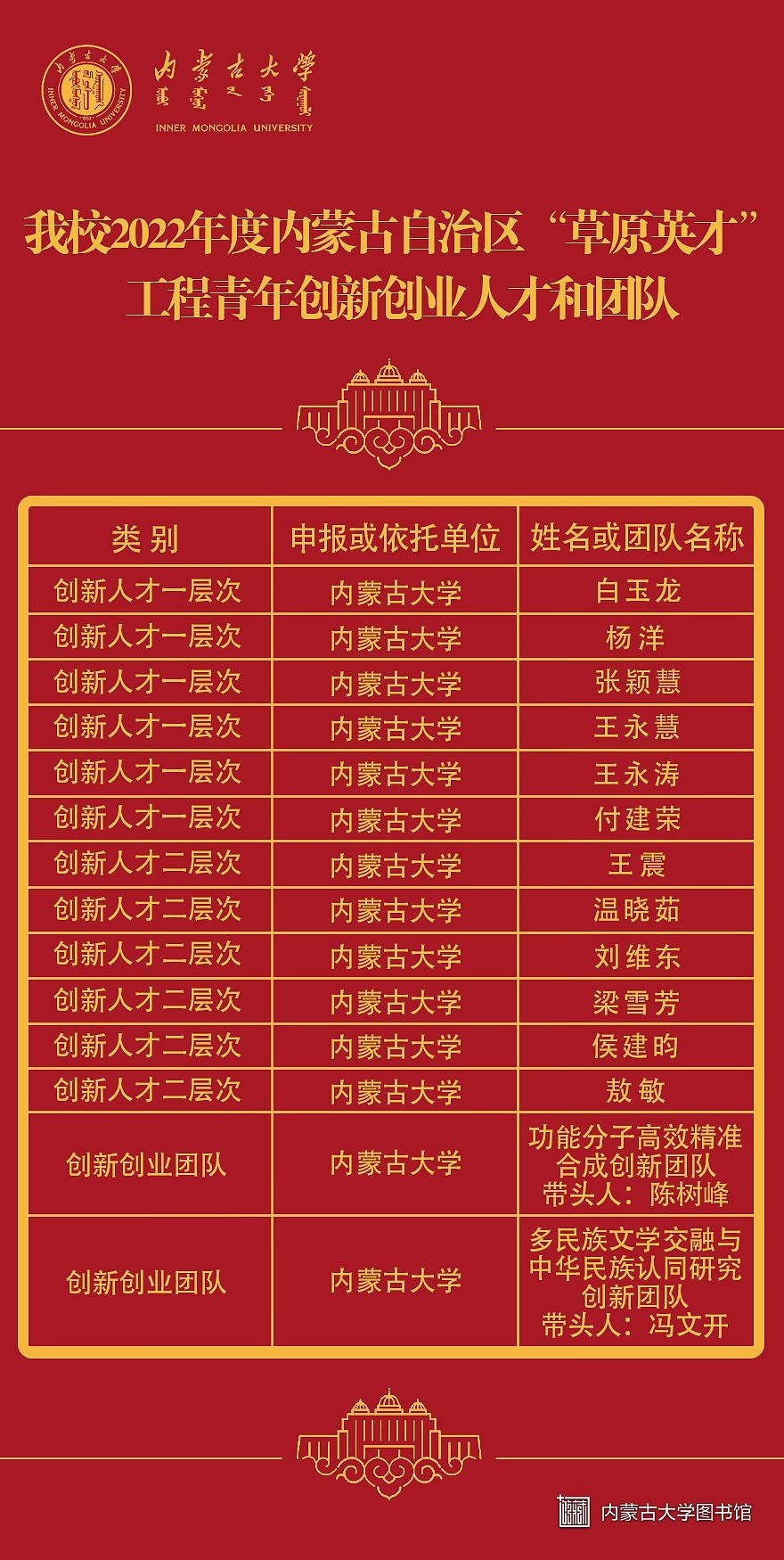 同时,2022年度“草原英才”工程青年创新创业人才评审结果揭晓,我校12名教师入选。其中白玉龙、杨洋、张颖慧、王永慧、王永涛、付建荣入选创新人才一层次,王震、温晓茹、刘维东、梁雪芳、侯建昀、敖敏入选创新人才二层次。功能分子高效精准合成创新团队(带头人:陈树峰)和多民族文学交融与中华民族认同研究创新团队(带头人:冯文开)入选创新创业团队。