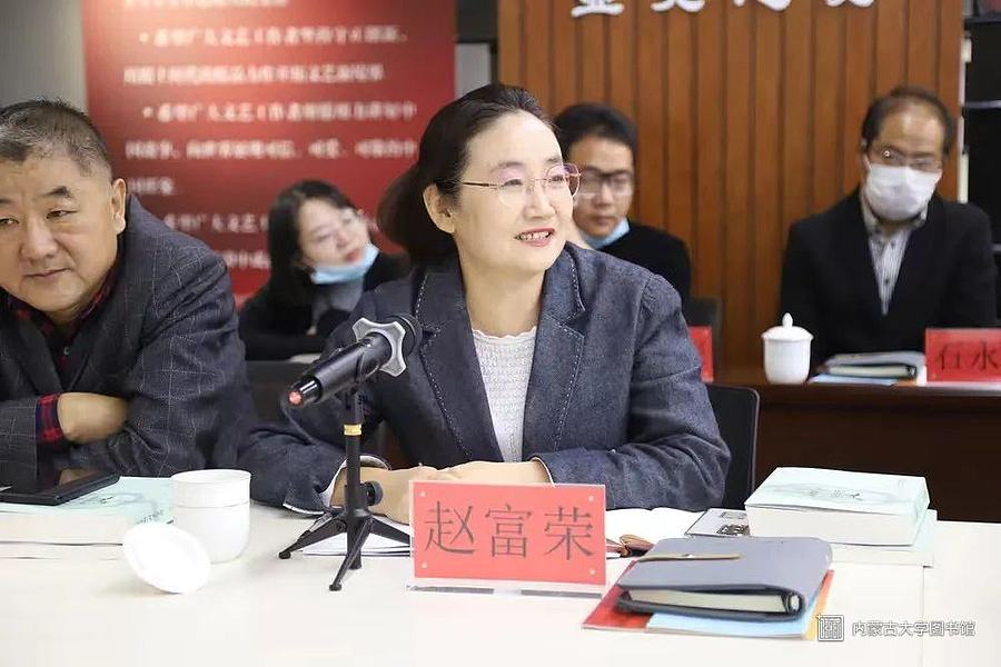 内蒙古文学馆馆长赵富荣介绍了文学馆开馆以来作为公共文化服务中心,为内蒙古文化建设、文学建设服务的工作情况和研读两部作品的体会。