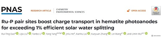 随着人们对可再生和环境友好能源的不断探索,光电催化(PEC)水分解作为绿色制氢最有前途的策略之一而受到广泛关注。我校化学化工学院和能源材料化学研究院武利民教授和王蕾教授联合团队在前期通过原位合成NiB 层大大提高BiVO4光电极的中性电解质 PEC性能(Sci. Adv. 2023, 9, eade4589),通过单原子掺杂光电极调控载流子传输(Nat. Commun. 2023, 14, 2640)基础上,针对a-Fe2O3光电极存在的电子迁移率低,电子-空穴复合严重,空穴扩散长度短(2至4 nm)和水氧化动力学慢等问题,设计并开发了一种Ru-P双原子位点负载的a-Fe2O3光阳极。